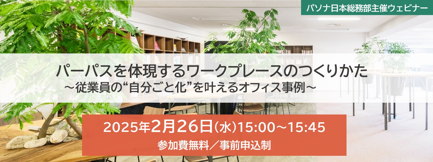 株式会社パソナ日本総務部(本社:大阪市中央区、代表取締役社長 佐野克也)は、企業向けオンラインセミナー『パーパスを体現するワークプレースのつくりかた~従業員の“自分ごと化”を叶えるオフィス事例~』を2月26日(水)にオンラインにて開催いたします。