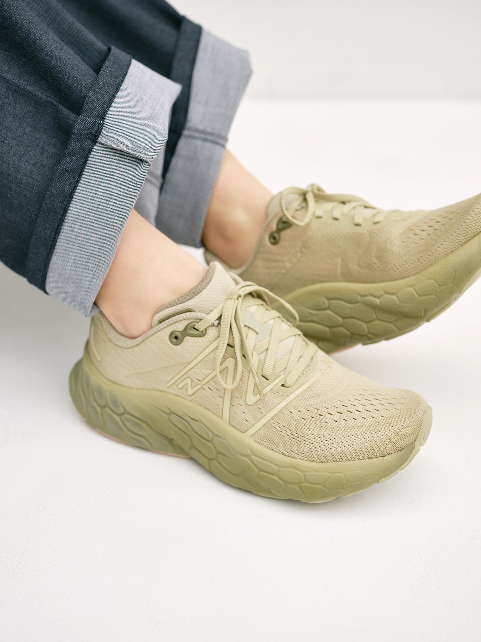 柔らかなクッション性と、軽やかな履き心地が特徴のモデルを、装いも春らしくカラーリング。ソールはクリアながら深いオリーブカラーにすることで全体を立体感のあるグラデーションに仕上げました。