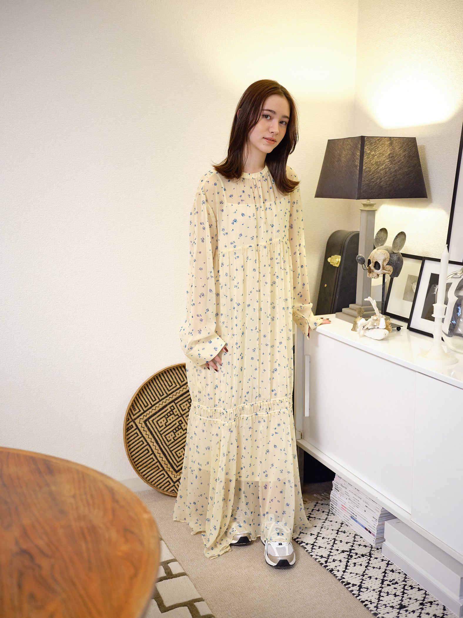 Iラインをベースに、裾に向かってフレアーがたっぷりと入ったモードなシルエット。プリントは、軽くて表情のある楊柳生地に小花柄をあしらったレトロな雰囲気。スポーティな曲線が美しいランニングシューズにも合わせやすいデザインのワンピースです。