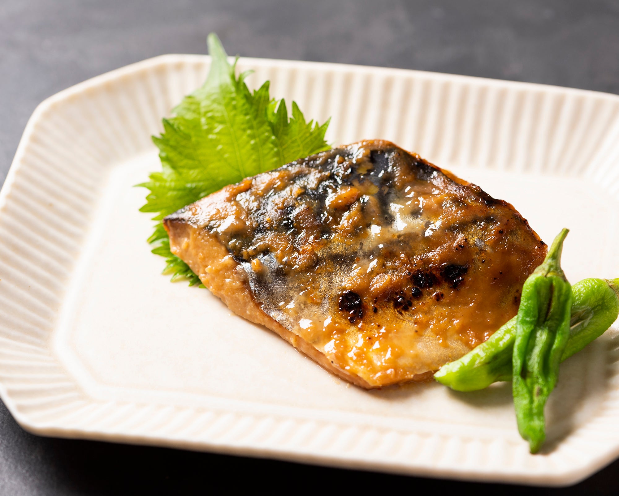 脂ののったさばを、赤味噌、西京味噌をブレンドし、甘酒、砂糖、薄口醤油などの入った、店主、村田明彦氏オリジナルの味噌床で2日間熟成してから、じっくりと焼き上げました。