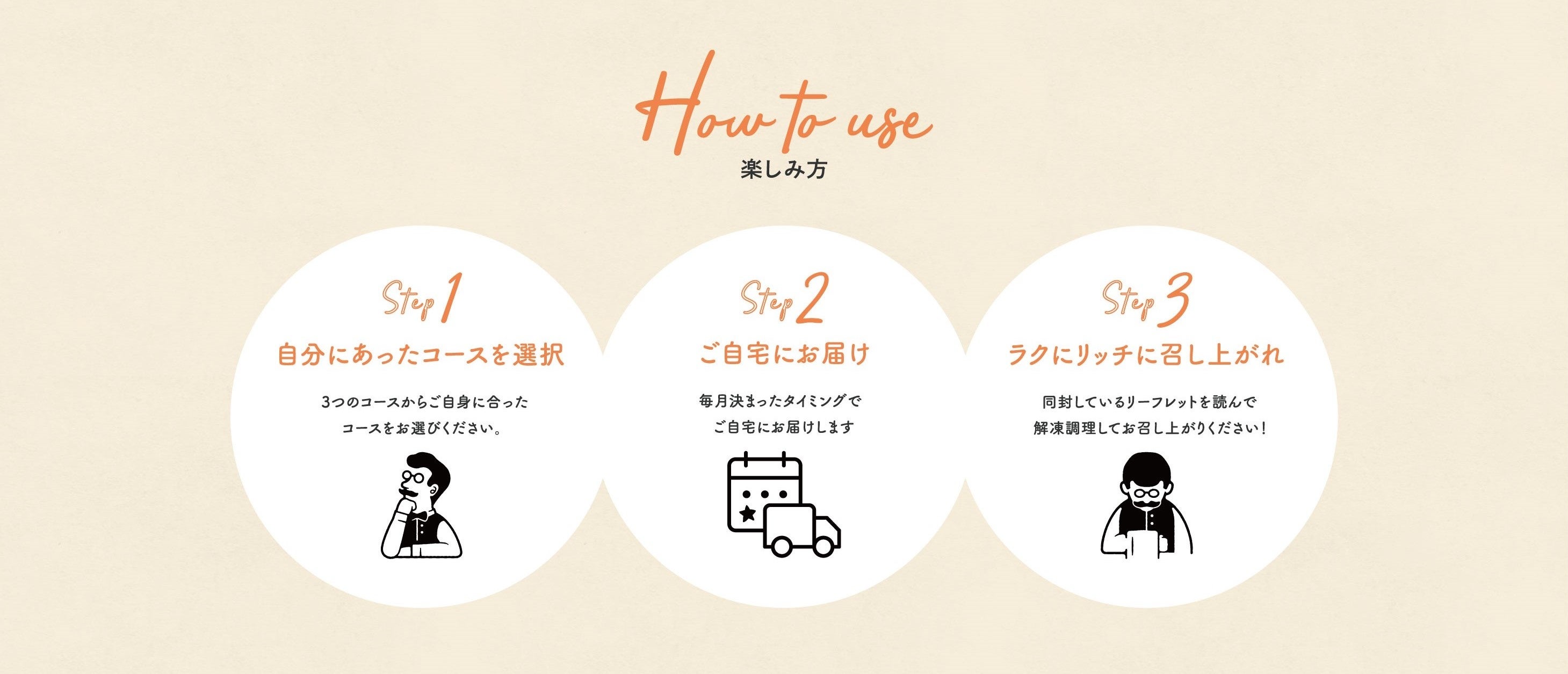 2.お客様にはメニュー内容の全容はお見せせず、一部の商品のみ公開。「届いたときのお楽しみ」を演出し、”おまかせ”でおいしい出会いをご提供。
