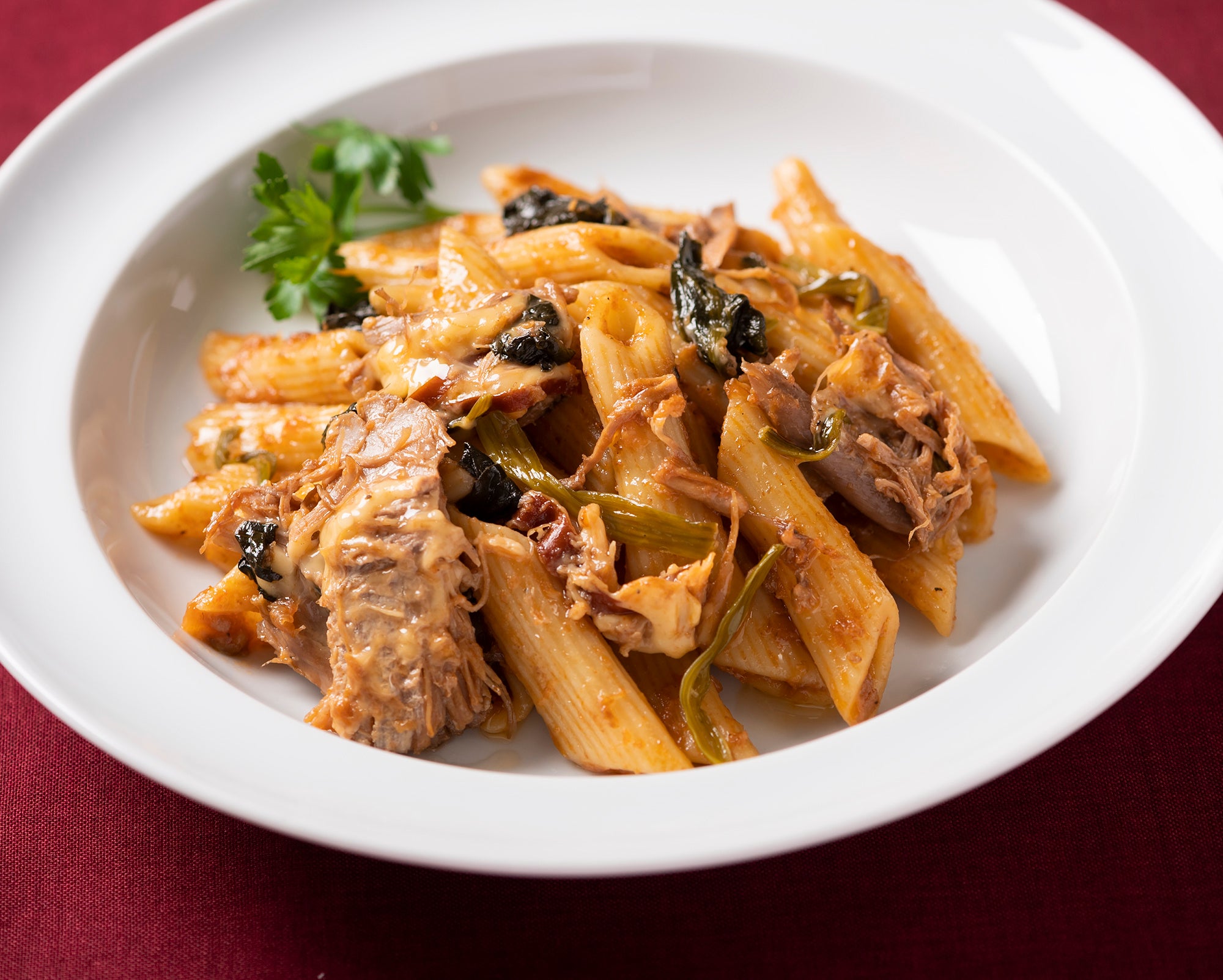 鴨のモモ肉を骨ごと、赤ワイン、ヴィネガー、フォンドヴォー、トマトで煮込んでソースにし、ペンネで和えました。ほうれん草とスモークチーズが独特のアクセントになっている一皿です。