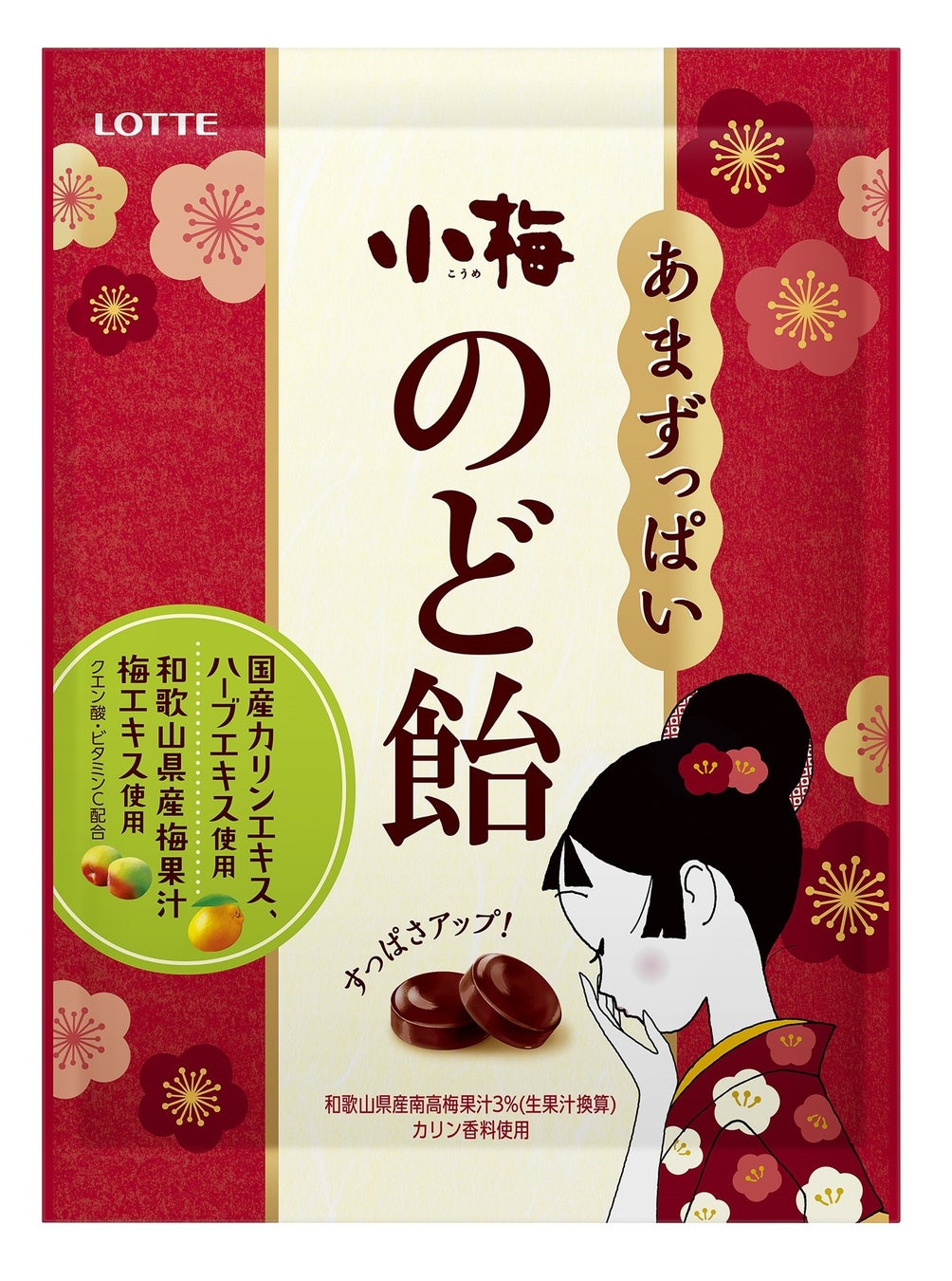 株式会社ロッテは10月11日(火)に「小梅のど飴(袋)」を発売します。あまずっぱい梅の味わいに、カリンとハーブのさわやかさがマッチしたのど飴で、すっぱさがアップしました。和歌山県産梅果汁と国産カリンエキスを使用しています。乾燥が気になる季節、キュッとあまずっぱい小梅のど飴をぜひお楽しみください!