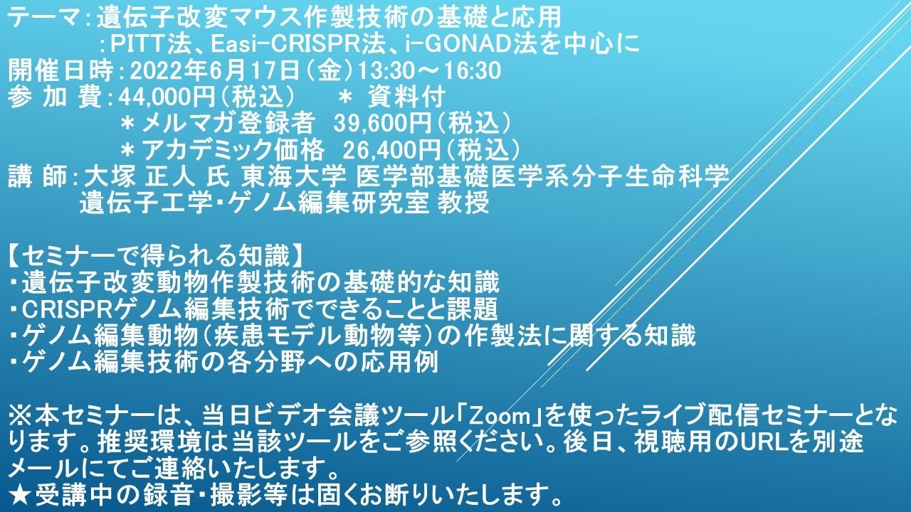 先端技術情報や市場情報を提供している(株)シーエムシー・リサーチ(千代田区神田錦町: https://cmcre.com/ )では、 各種材料・化学品などの市場動向・技術動向のセミナーや書籍発行を行っておりますが、 このたび「遺伝子改変マウス作製技術の基礎と応用:PITT法、Easi-CRISPR法、i-GONAD法を中心に」と題するセミナーを、 講師に大塚 正人 氏 東海大学 医学部基礎医学系分子生命科学 遺伝子工学・ゲノム編集研究室 教授)をお迎えし、2022年6月17日(金)13:30より、 ZOOMを利用したライブ配信で開催いたします。 受講料は、 一般:44,000円(税込)、 弊社メルマガ会員:39,600円(税込)、 アカデミック価格は26,400円(税込)となっております(資料付)。