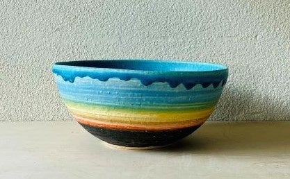 まるで沖縄の海と夕焼けを映したような鮮やかな青色が印象的な器
