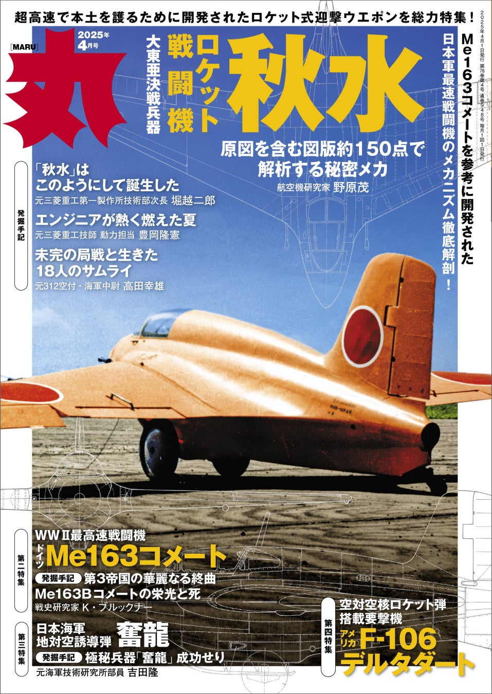 産経新聞グループの潮書房光人新社は、戦史に学ぶ人のミリタリー総合誌、月刊『丸』の4月号を発売しました。特集は「ロケット戦闘機 秋水」。本土防空の切り札として開発された日本最速のロケット戦闘機のメカニズムを150点以上の図版で解析します。当時の開発担当技術者や隊員の発掘手記も掲載します。このほかドイツの「Me163コメート」や日本海軍の対空誘導弾「奮龍」などのロケットウエポンも紹介。トランプ外交でウクライナ戦争停戦なるか、欧州最新軍事情勢も読み解きます。