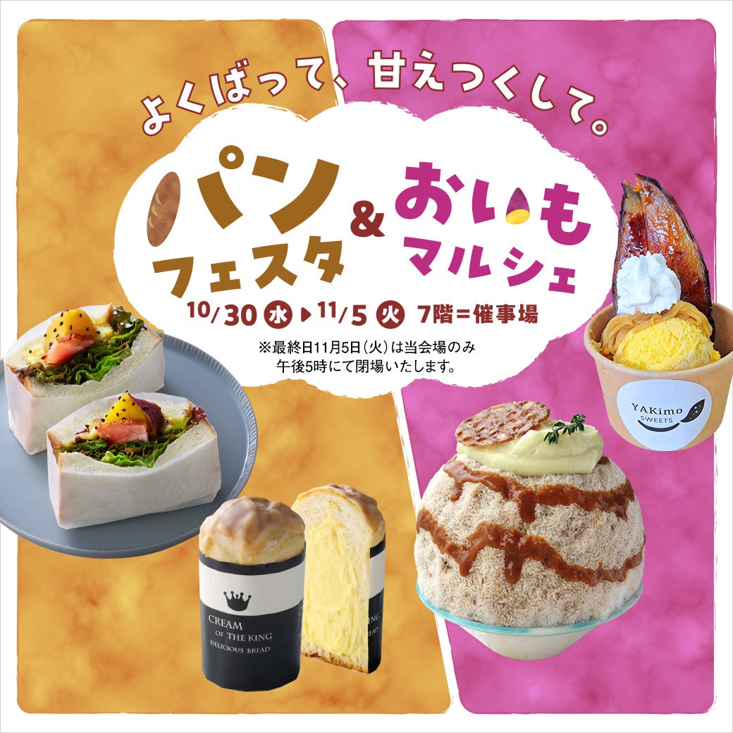 そごう大宮店の人気催事【パンフェスタ】に加え今年は、近年まで人気が衰えることを知らない「さつまいもスイーツ」が勢ぞろいする【おいもマルシェ】を同時開催いたします。