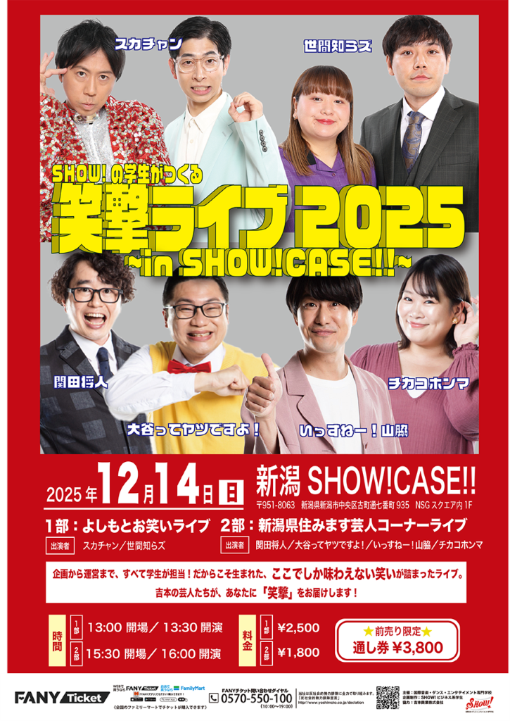 NSGグループの国際音楽・ダンス・エンタテイメント専門学校では、吉本興業株式会社の協力のもと、学生主体によるお笑いライブプロジェクト「笑撃ライブ2025 ~in SHOW!CASE!!~」を、2025年12月14日(日)に開催いたします。このたび、いよいよチケットの一般販売がスタートしました。