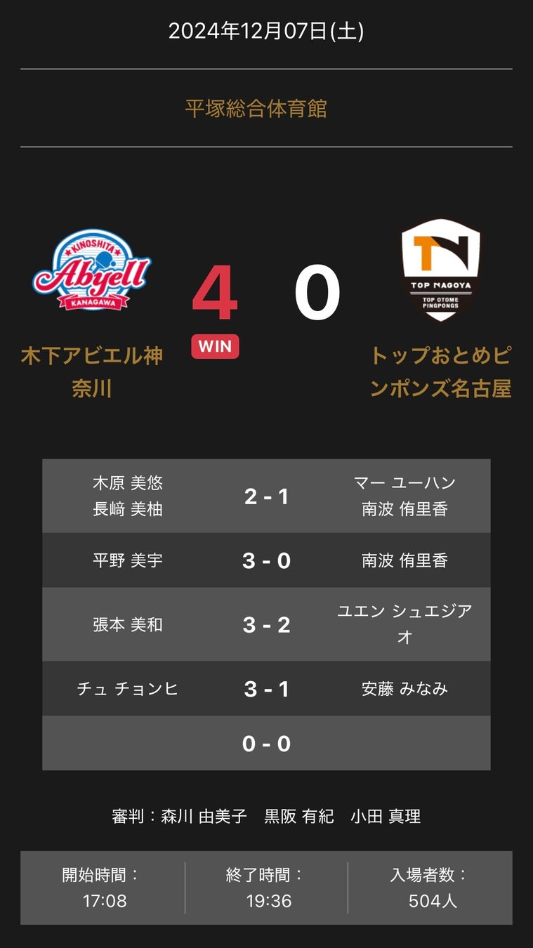 ノジマTリーグ 2024-2025シーズン 公式戦 12月7日開催 「木下アビエル神奈川 vs トップおとめピンポンズ名古屋」の試合は、4-0で木下アビエル神奈川が勝利しました。