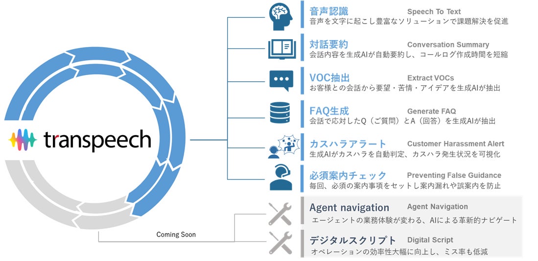 トランスコスモスは、「trans-DX for Support」強化の一環で、2018年より提供してきた音声認識ソリューション「transpeech(トランスピーチ)」をフルリニューアルしました。今回のリニューアルは従来の音声認識や対話要約機能を軸に、コンタクトセンター現場の「VOC抽出」「FAQ生成」「カスタマーハラスメントアラート」「必須案内チェック」などのサポート機能も追加しています。すべての機能はAIテクノロジーと融合しており、能動的なサポートでオペレーターに寄り添うAIアシストソリューションとして、進化したコンタクトセンターオペレーションを実現します。