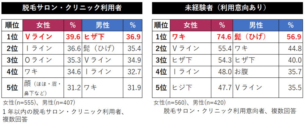 脱毛サロン・クリニックの利用者に対して、未経験者の利用意向者の割合は、女性はほぼ同数、男性は2倍近く存在し、マーケットの今後の広がりがうかがえます。利用者・利用意向者は脱毛サロン・クリニックの利用に対して「脱毛効果が高いから」「自分ではできない/やりにくい部分もできるから」「脱毛効果が長続きするから」を男女とも理由の上位にあげており、プロにしかできない価値を感じています。脱毛サロン・クリニック利用者が「今後処理したい部位」の1位は、女性「Vライン」、男性「ヒザ下」となっており、これからさらに需要が伸びていくのではないでしょうか。