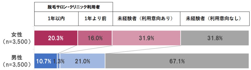 女性の1年以内の脱毛サロン・クリニック利用者は、20.3%、男性は10.7%。1年以上前の利用者は、女性が16.0%で男性が1.3%。未経験者・利用意向者は女性が31.9%、男性は21.0%で利用者の2倍近く存在。
