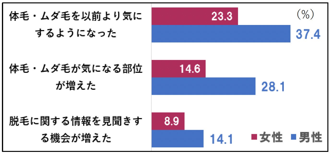 コロナ禍を機にムダ毛・脱毛に関心を持つ男性は女性以上に増えています。在宅時間が伸びたことで、オンライン会議等で自分の顔をみる機会が増えており、髭のムダ毛・剃り跡などが気になることが増えたのかもしれません。脱毛によって髭の形を整えたい、髭剃りによる肌荒れをなくしたいといった理由から、脱毛サロンやクリニックを利用する男性が増加する可能性があります。