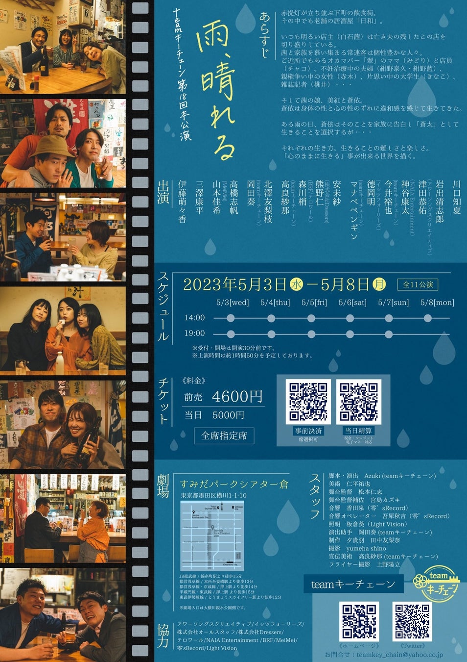 teamキーチェーン(代表:Azuki)主催、teamキーチェーン第18回本公演『雨、晴れる』が2023年5月3日 (水・祝) ~2023年5月8日 (月)にすみだパークシアター倉(東京都墨田区横川1-1-10)にて上演されます。チケットはカンフェティ(運営:ロングランプランニング株式会社、東京都新宿区、代表取締役:榑松 大剛)にて発売中です。