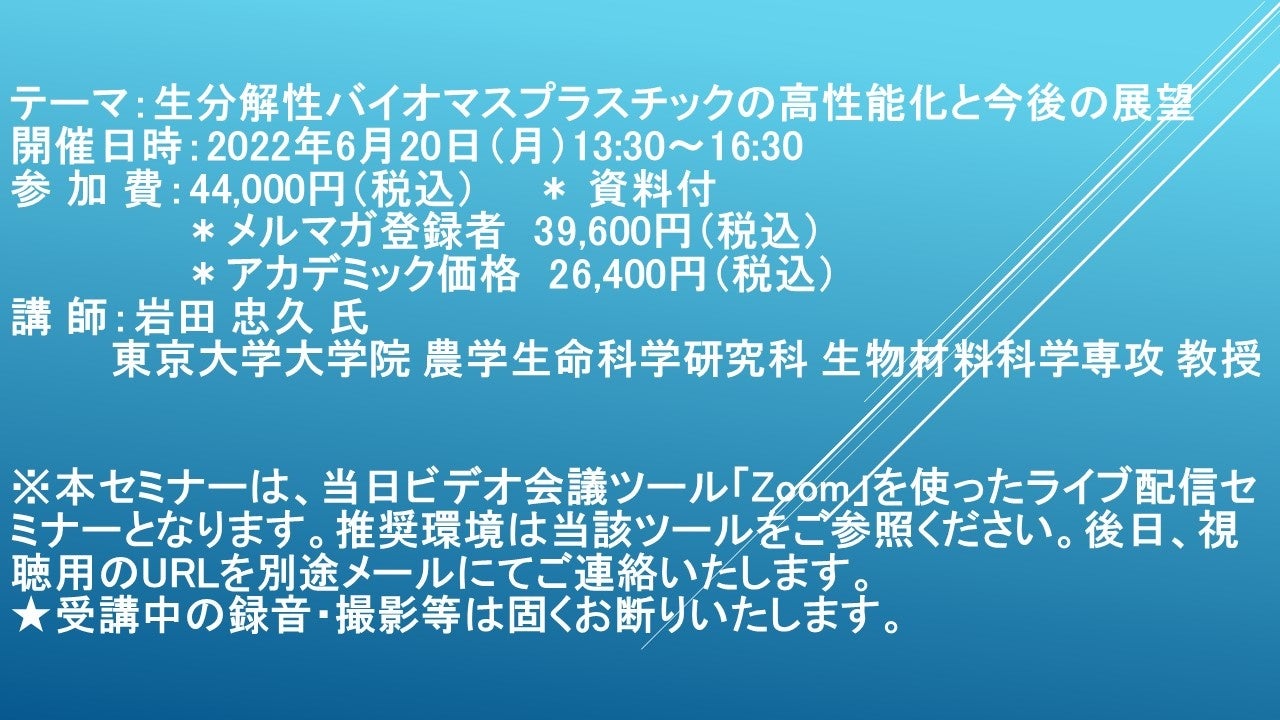 先端技術情報や市場情報を提供している(株)シーエムシー・リサーチ(千代田区神田錦町: https://cmcre.com/ )では、 各種材料・化学品などの市場動向・技術動向のセミナーや書籍発行を行っておりますが、 このたび「生分解性バイオマスプラスチックの高性能化と今後の展望」と題するセミナーを、 講師に岩田 忠久 氏 東京大学大学院 農学生命科学研究科 生物材料科学専攻 教授)をお迎えし、2022年6月20日(月)13:30より、 ZOOMを利用したライブ配信で開催いたします。 受講料は、 一般:44,000円、 弊社メルマガ会員:39,600円、 アカデミック価格は26,400円となっております(資料付)。