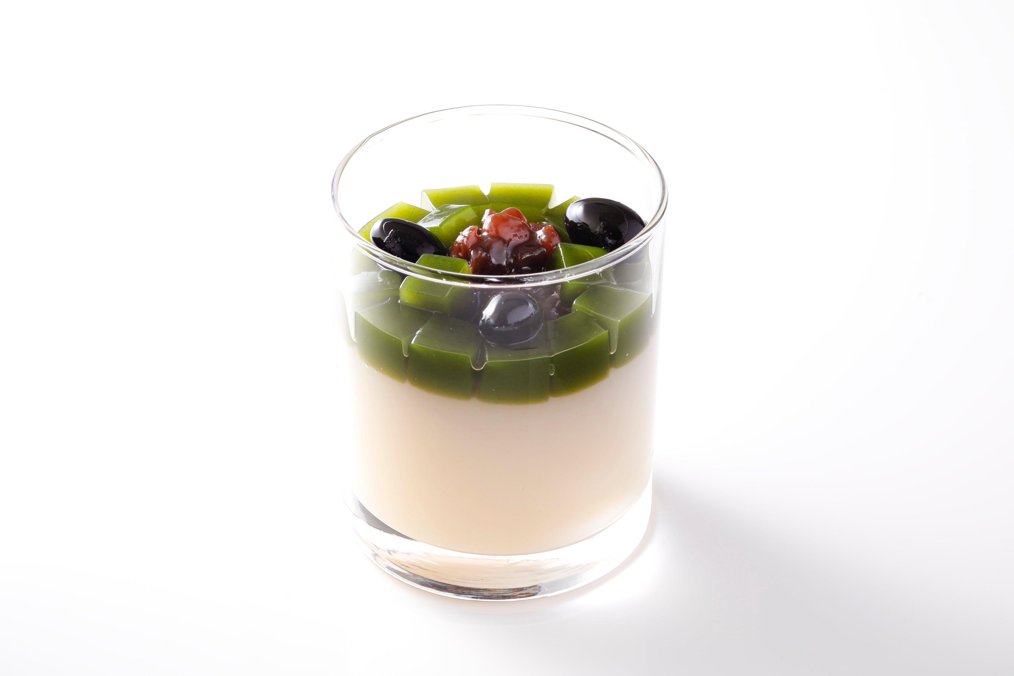 和菓子唯一の発酵食品である「元祖くず餅」を創業当時から変わらぬ製法で受け継いできた老舗、『船橋屋』の「くず餅乳酸菌®」を使用したゼリーに、抹茶寒天や丹波産の黒豆、つぶあんをあしらいました。※ビュッフェサイズではトッピングの内容が一部異なります。