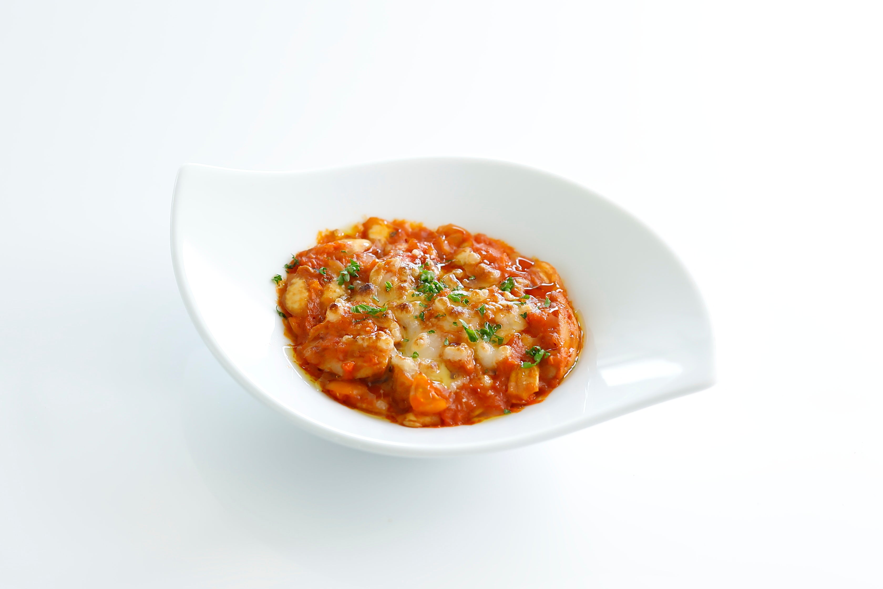大豆の成分から抽出した植物性たんぱく質を肉に見立てた「大豆ミート」を、トリッパと呼ばれる牛の胃袋の代わりに使用し、炒めた野菜からの出汁とトマトでじっくりと煮込んだイタリア料理。大豆の生産は畜肉よりも環境負荷が低く環境にもやさしい一面も。