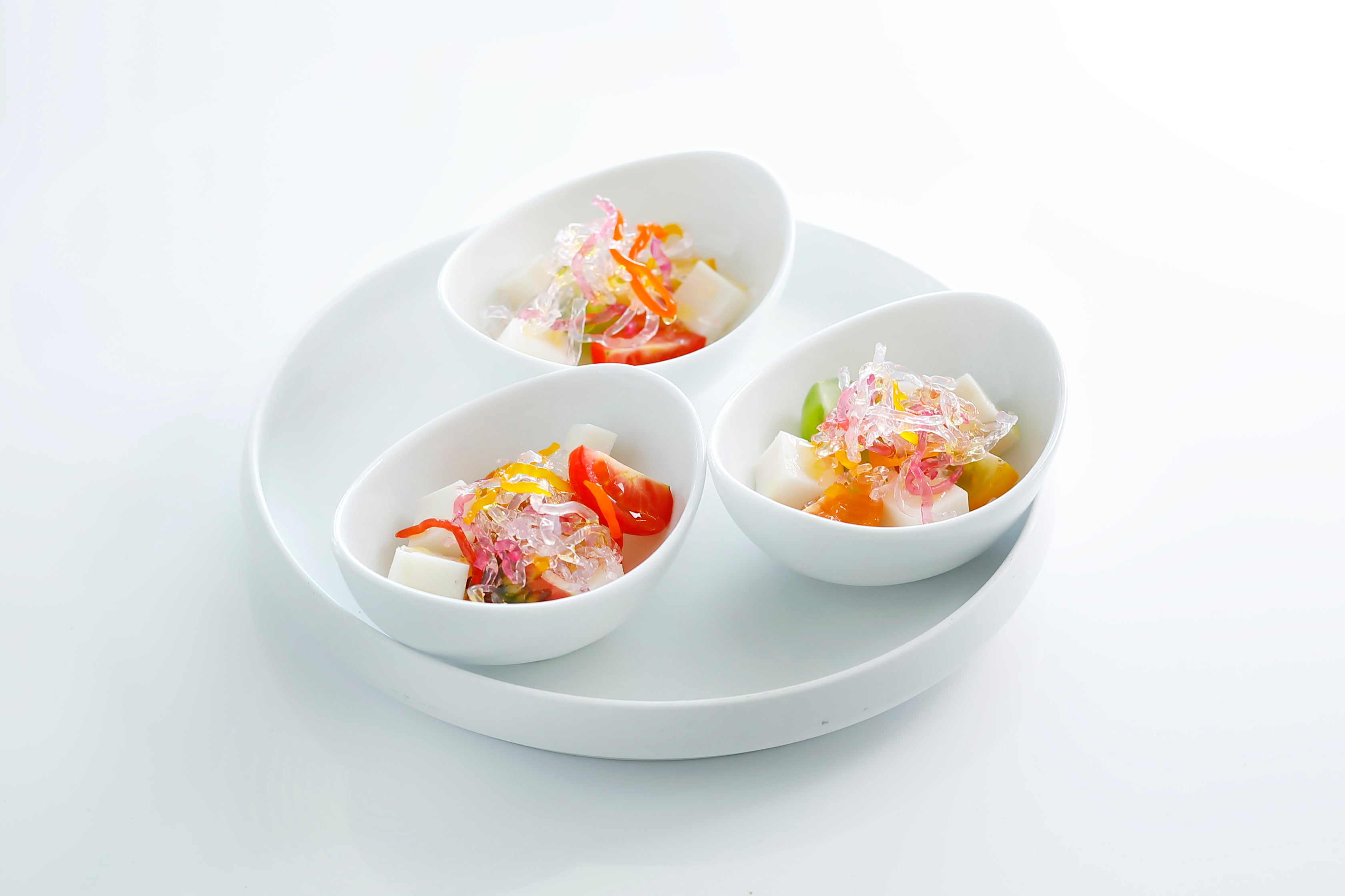 モッツァレラチーズのような食感の豆乳チーズに瑞々しいトマトを添えました。プチプチとした食感で食物繊維が豊富な海藻麺を添え、オリーブオイル&レモンでさっぱりとした仕上がりに。