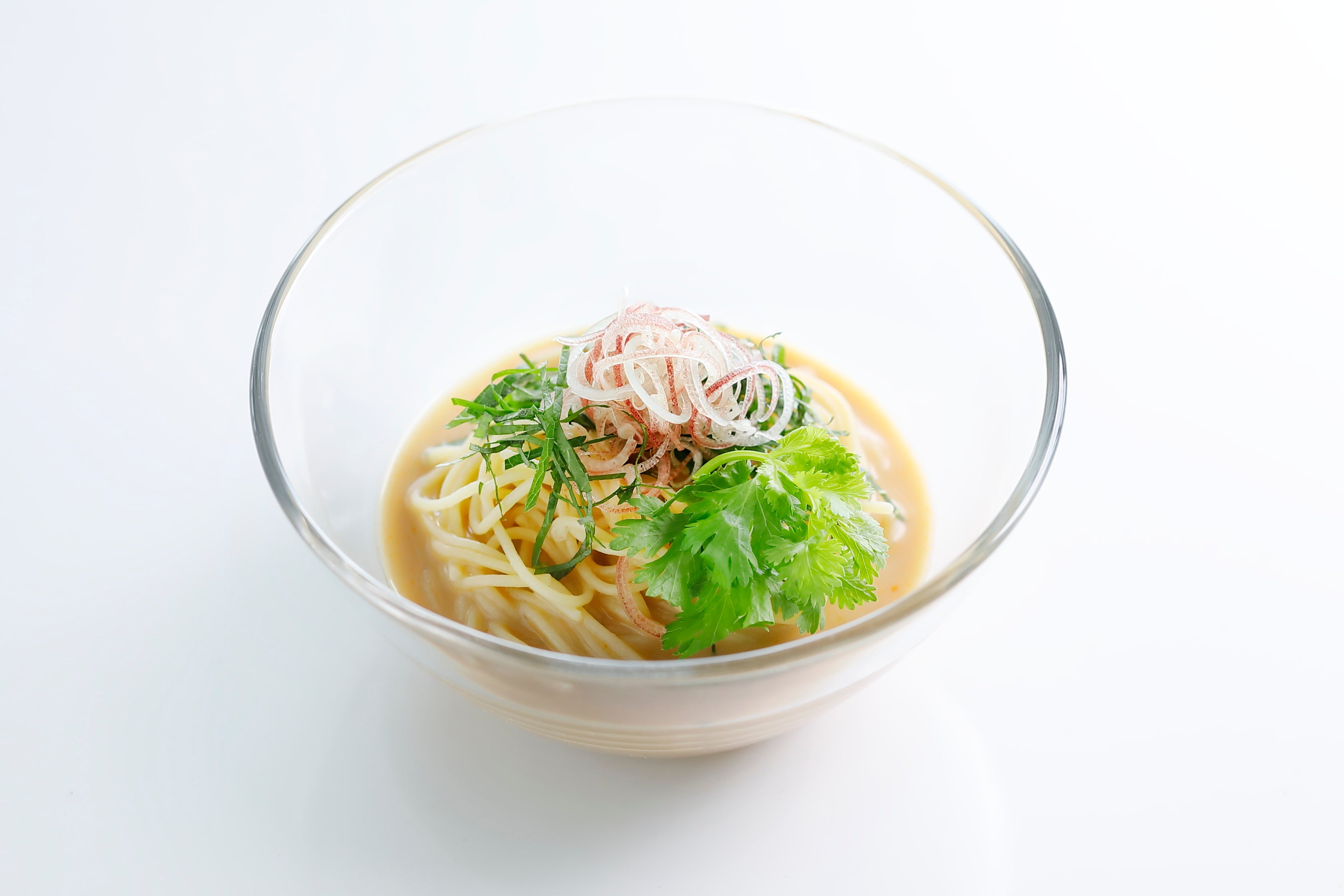 調理工程において廃棄してしまう植物の皮や芯などを可能な活かすことで、環境への配慮を実現した黄えんどう豆100%で作る「ゼンブヌードル」。野菜で出汁を取ったベジタブルスープを豆乳で仕上げた特製ゴマダレと合わせました。