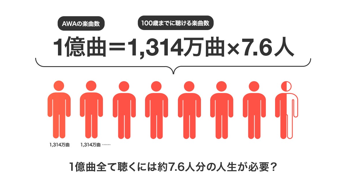 AWA株式会社(本社:東京都港区、代表取締役CEO:冨樫晃己)が運営する、サブスクリプション型(定額制)音楽ストリーミングサービス「AWA(アワ)」は、国内初(※)となる配信楽曲数1億曲を突破いたしました。今回、1億曲までの配信楽曲の推移や、配信楽曲の世界分布など、インフォグラフィックをご用意しました。また、1億曲を聴く為に必要な時間を計算し、より多くの楽曲を聴いてもらうために、AWAがいままで行ってきた機能開発や想いなどをご紹介します。
