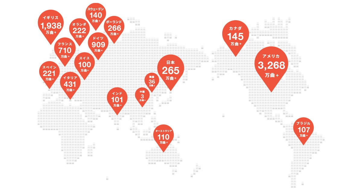 また、配信楽曲の世界分布に注目すると、最も配信楽曲数が多いのはアメリカの3,268万曲で、次いでイギリスの1,938万曲、ドイツの909万曲と続きます。国内の楽曲は、265万曲で、邦楽と洋楽の割合は3対97となっています。その他にも、フランス、イタリアなど、昔からの音楽文化が根強い国の楽曲が多く配信されています。