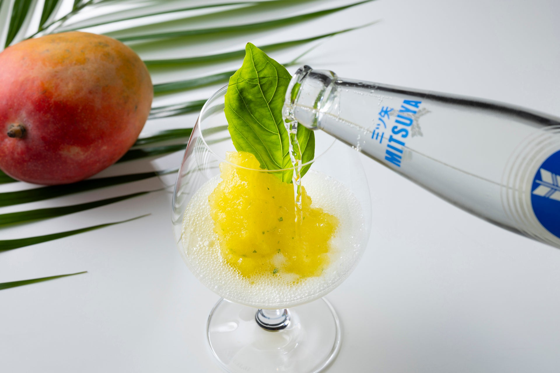 マンゴーの濃厚な甘みを生かしたフローズンに、やさしい炭酸が爽やかさを添える夏の一杯。仕上げに加えるバジルが香りの層を生み出し、味わいに奥行きを与える、ミクソロジースタイルの一杯です。