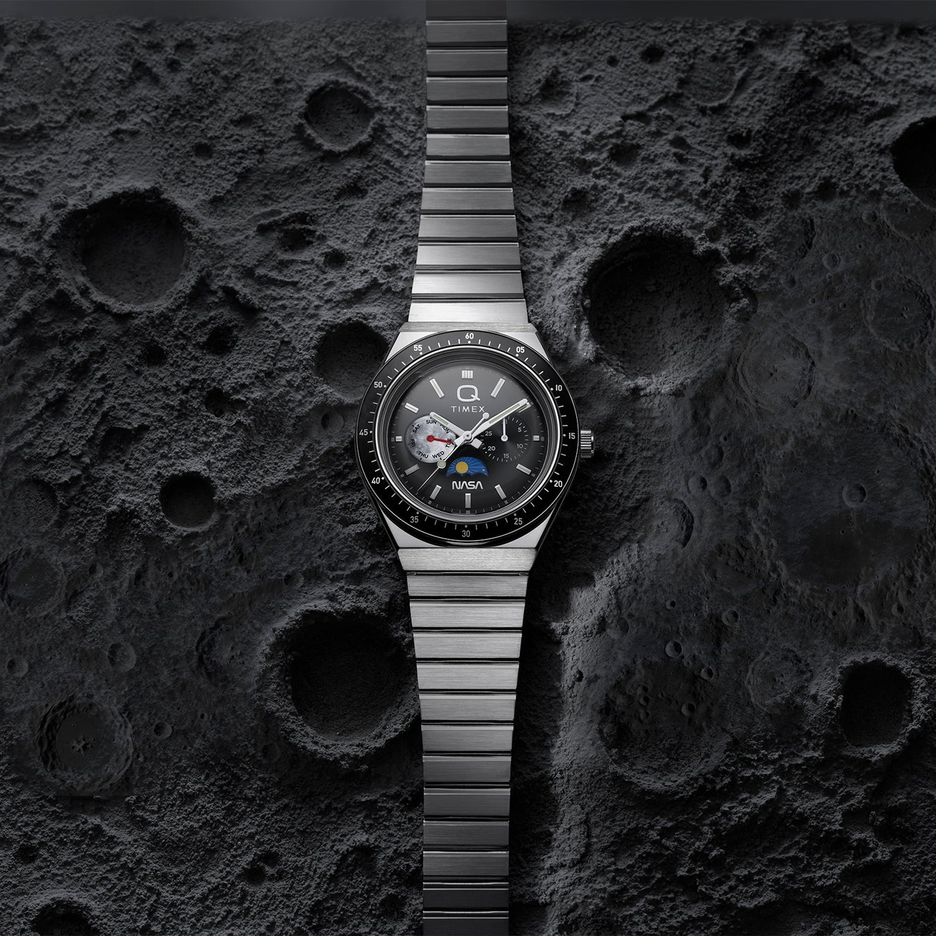 1970年代のクォーツウォッチを現代に蘇らせた「Q Timex」のレトロな造形美に、宇宙探索のロマンを詰め込んだコラボレーションです。