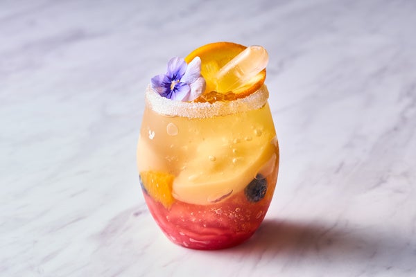 ザクロの果汁から作られるフルーティーなシロップで甘酸っぱさを加えた白桃のジュレと、スパークリングゼリーが織りなす色鮮やかな2層の中に、白桃・オレンジ・ブルーベリーが入った夏らしく華やかな一品です。フルーツの甘みを感じつつ、さっぱりとしたのどごし爽やかなヴェリーヌは、グラスに添えたスポイトに入ったピーチリキュールシロップをお好みでかけてお楽しみください。