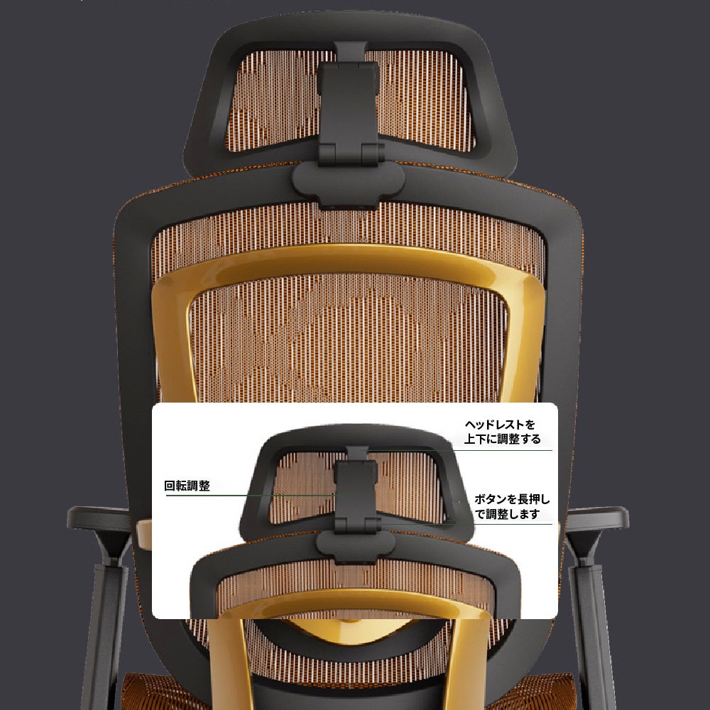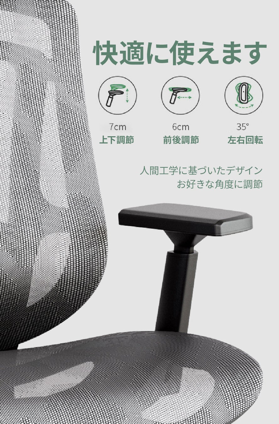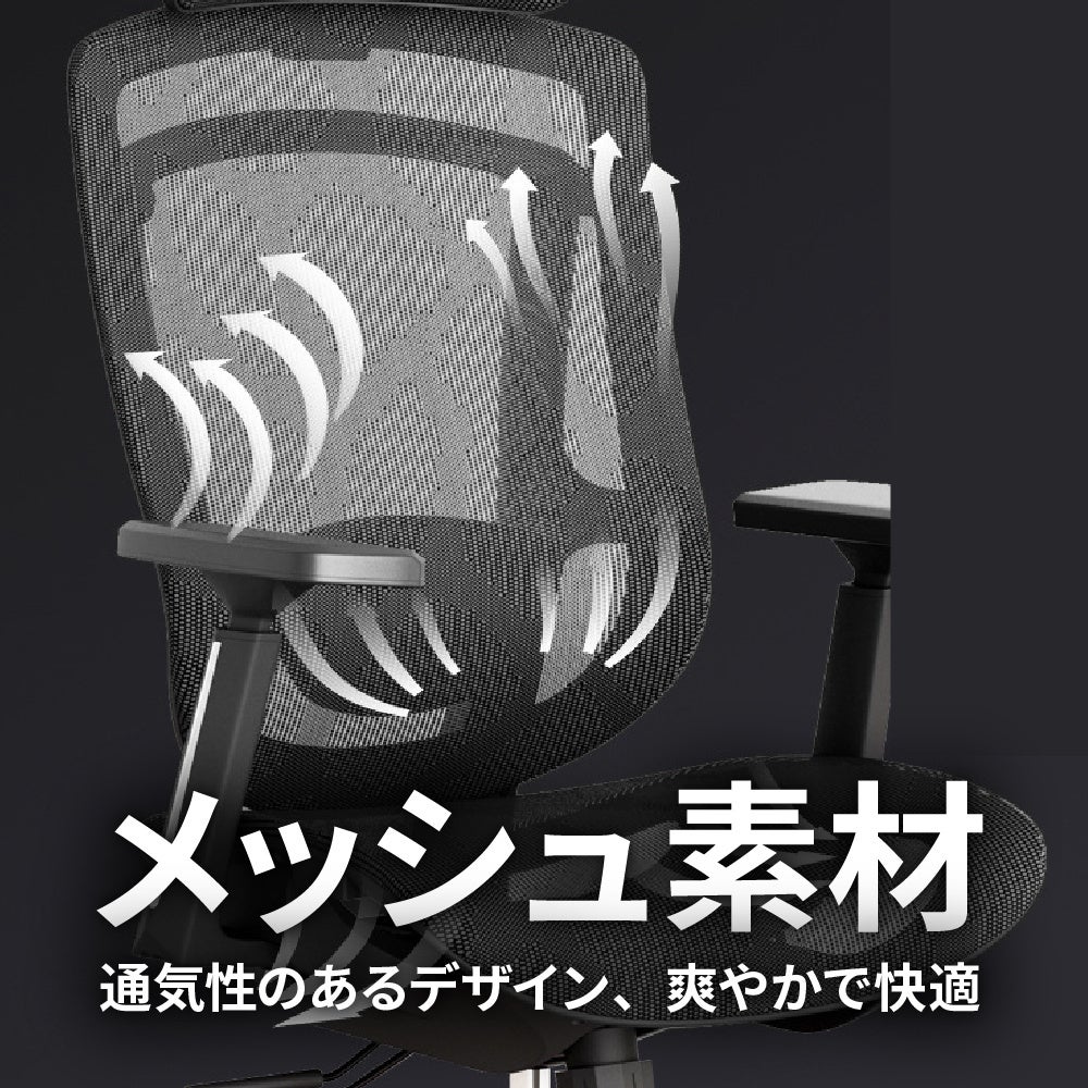 昇降式回転ヘッドレストが首をサポートし、通気性のあるメッシュ素材が一日中快適に過ごせる環境を提供します。