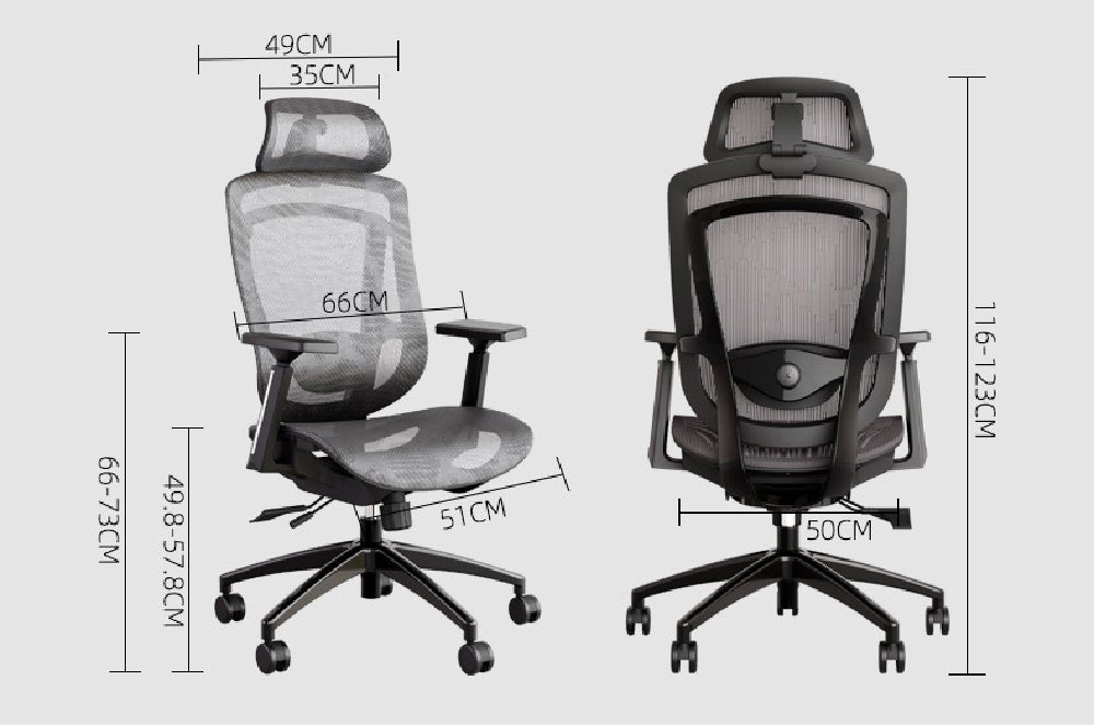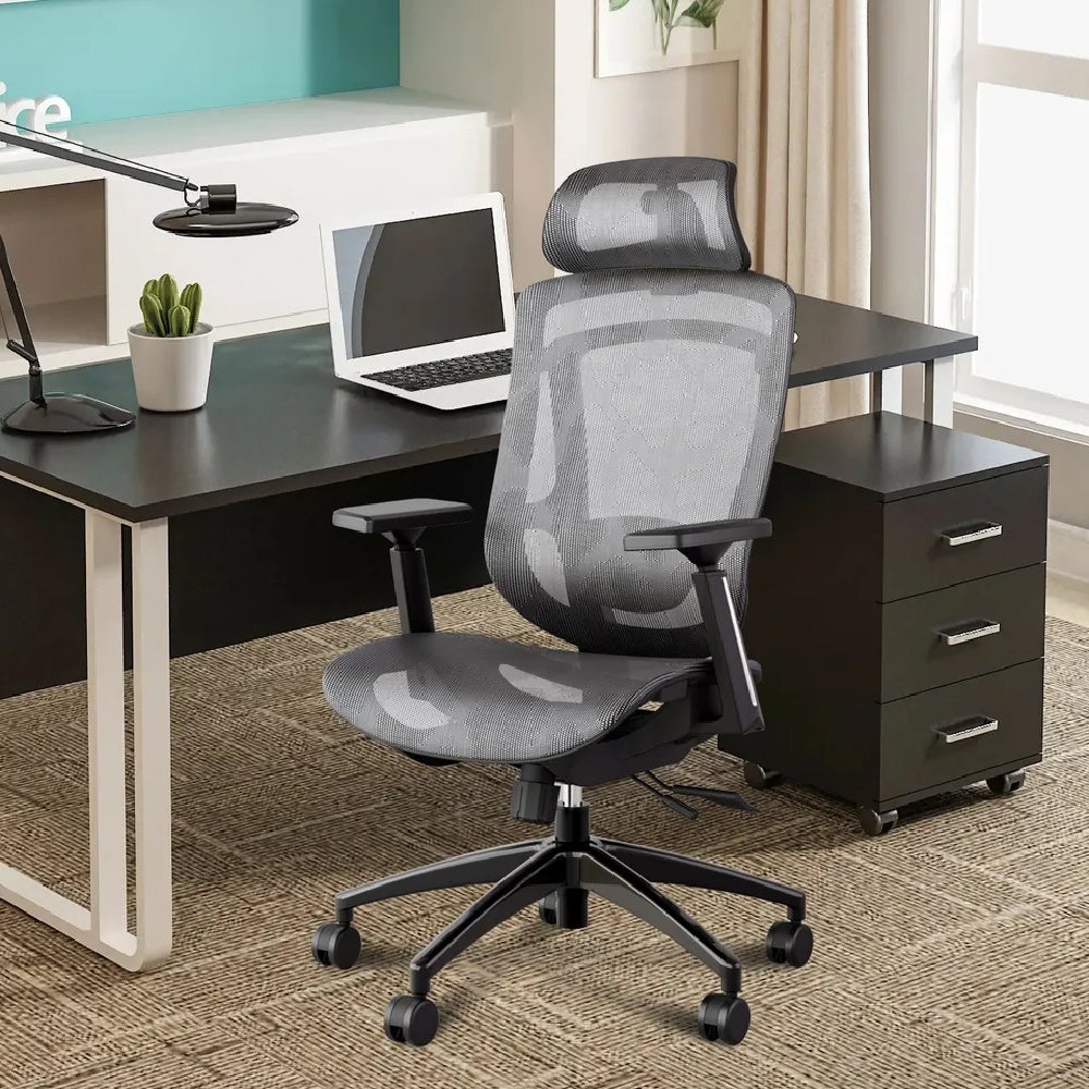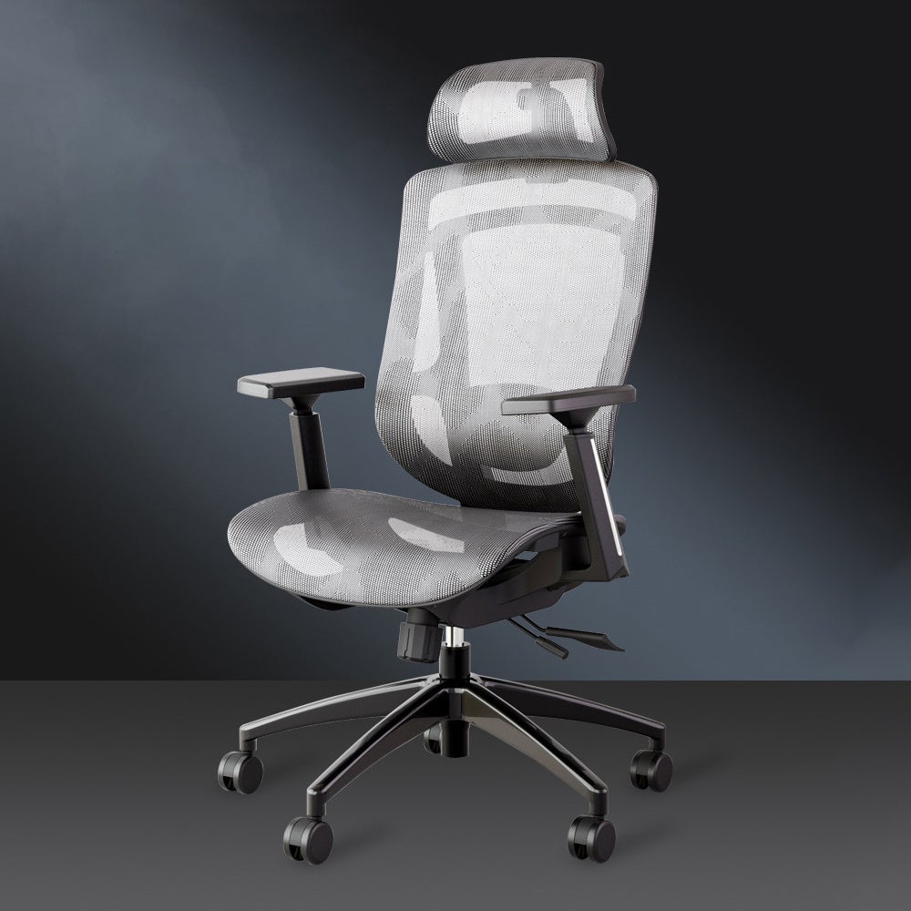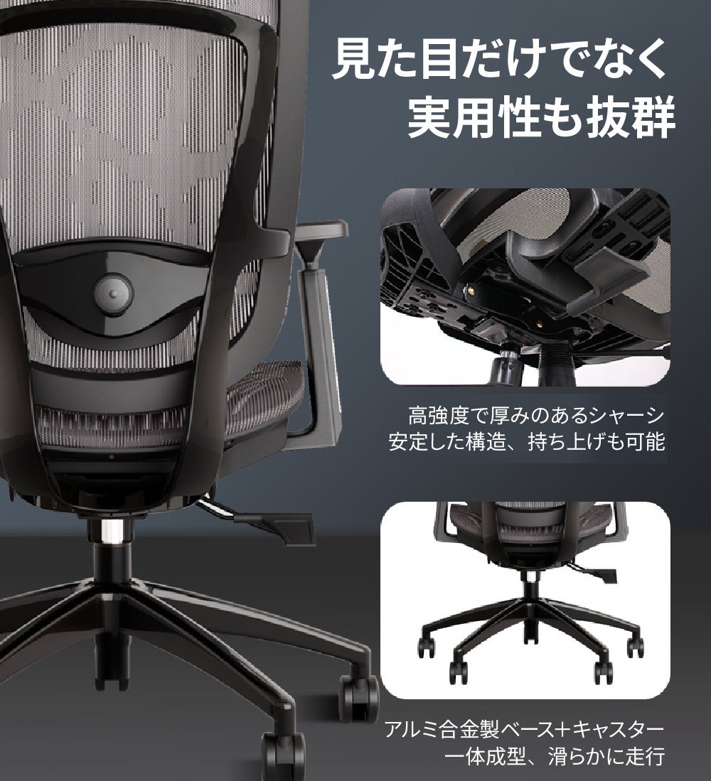 昇降式回転ヘッドレストが首をサポートし、通気性のあるメッシュ素材が一日中快適に過ごせる環境を提供します。