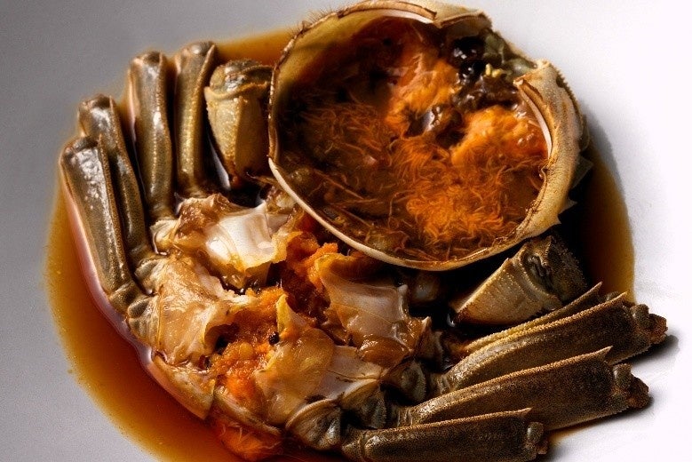 紹興酒に数種類の香辛料を加えた特製ダレに生きた蟹を漬ける「上海蟹の紹興酒漬け」。隅々まで味の染み込んだ蟹肉と濃厚な蟹味噌がたまらない一品です。