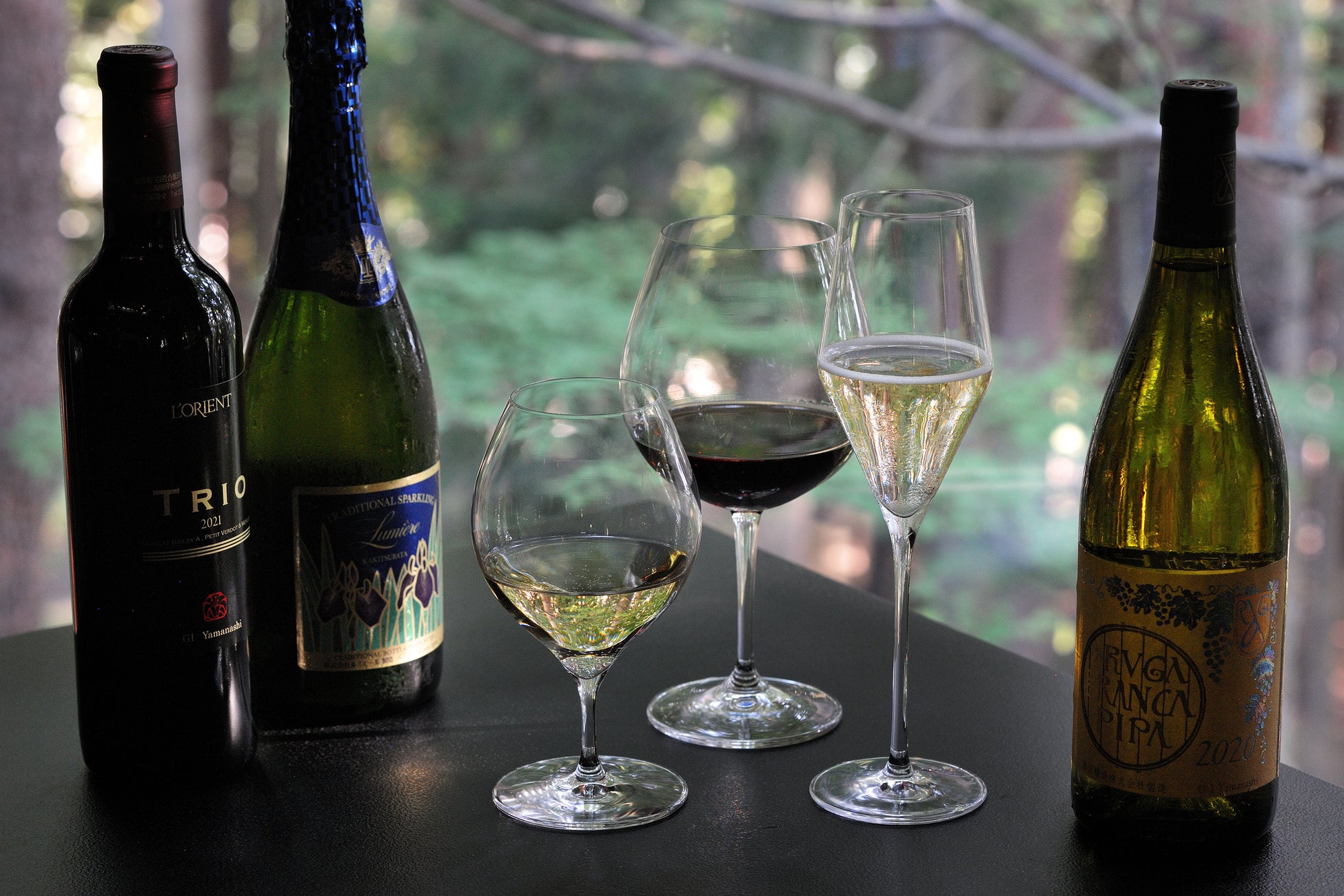 星のや富士のソムリエがセレクトするペアリングのコースでは、山梨ワインを含め3種類のワインを提供します。山梨県はワインの名産地としても知られており、個性豊かなさまざまなワインを楽しむことができます。ディナーコース「ガストロノミック・ワイルド」で提供される料理の特徴を活かすワインを、こだわりのグラスで提案します。