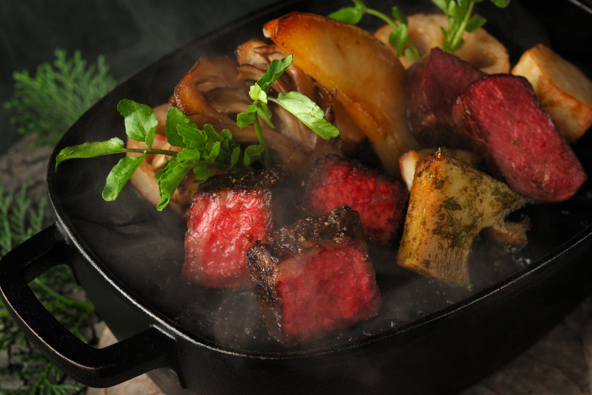 ダッチオーブンに保温効果のある富士山溶岩を敷き、旬の食材を詰め込んだ「冬の森籠り」をイメージしたメイン料理です。秋に収穫・乾燥させたポルチーニをまとわせた牛サーロインと、キノコ醤油麹で旨味と柔らかさを増した鹿ロースを、炭火で香ばしく焼き上げます。春菊と鮑の肝を合わせた煮鮑のジェノベーゼ、コンソメの旨味を閉じ込めた八幡芋や蓮根などの根菜をフリットにして提供します。