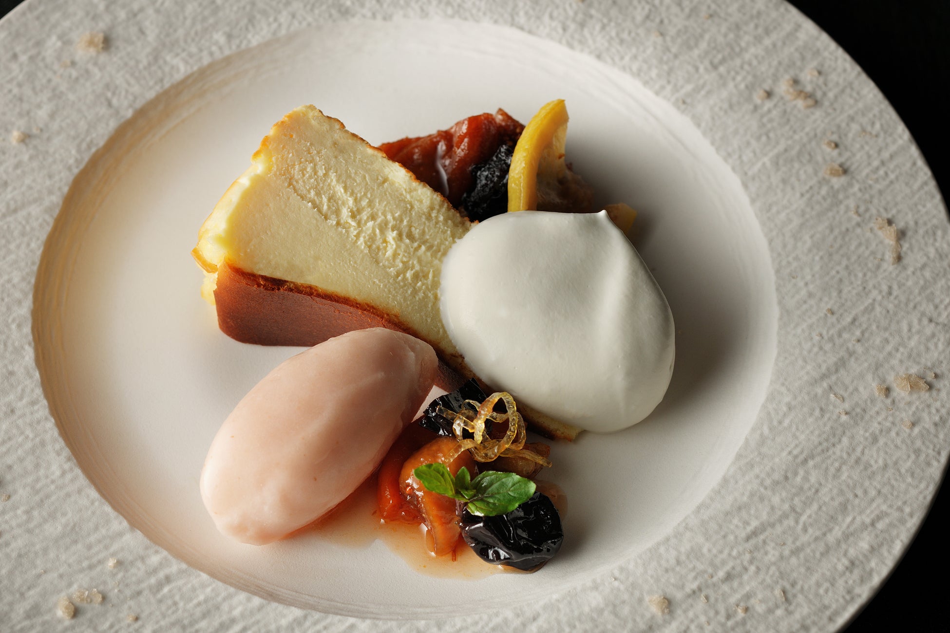 夏から秋にかけて収穫し、素材の旨味を閉じ込めた巨峰やイチジク、杏子(あんず)のドライフルーツを、シナモンなどの5種のスパイスと合わせてコンポートに仕立てました。バスクチーズケーキにコンポート、林檎のソルベやシャンティクリームを添えることで、酸味やコクなど様々な味の重なりを感じられます。アクセントとして燻製塩を添え、味わいの変化も楽しめます。