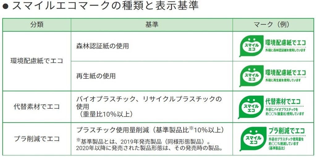 これらに基づく様々な容器包装を通じての環境配慮への取り組みについて、お客様に分かりやすくお伝えするために、 2022年より独自の環境配慮基準をクリアした製品に「スマイルエコマーク」を順次表示いたします。