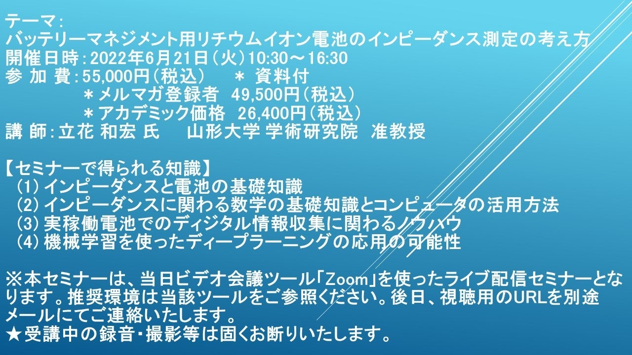 先端技術情報や市場情報を提供している(株)シーエムシー・リサーチ(千代田区神田錦町: https://cmcre.com/ )では、 各種材料・化学品などの市場動向・技術動向のセミナーや書籍発行を行っておりますが、 このたび「バッテリーマネジメント用リチウムイオン電池のインピーダンス測定の考え方」と題するセミナーを、 講師に立花 和宏 氏 山形大学 学術研究院 准教授)をお迎えし、2022年6月21日(火)10:30より、 ZOOMを利用したライブ配信で開催いたします。 受講料は、 一般:55,000円、 弊社メルマガ会員:49,500 円、 アカデミック価格は26,400 円となっております(資料付)。