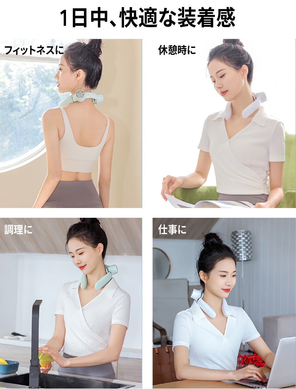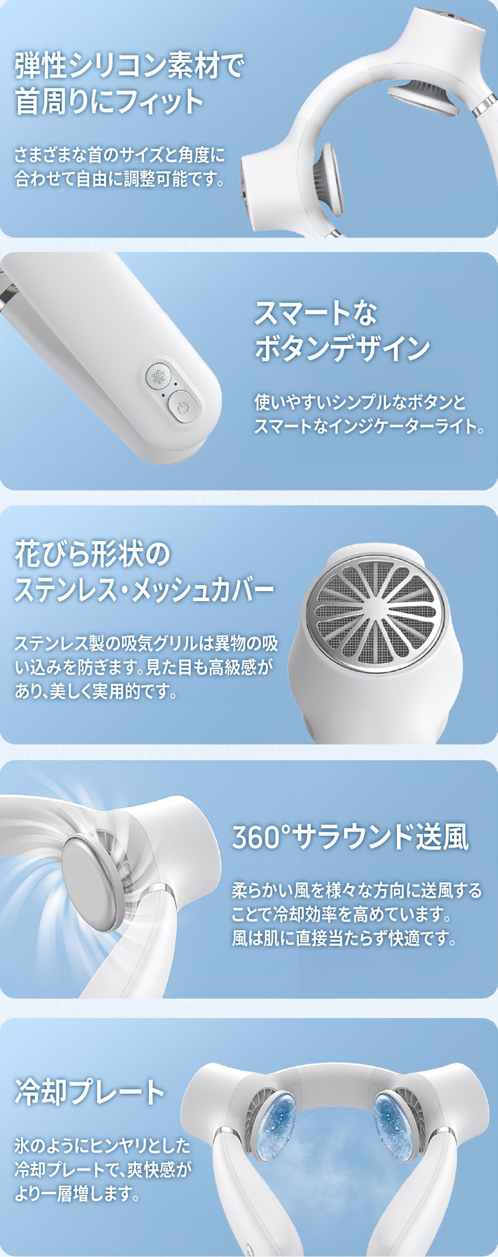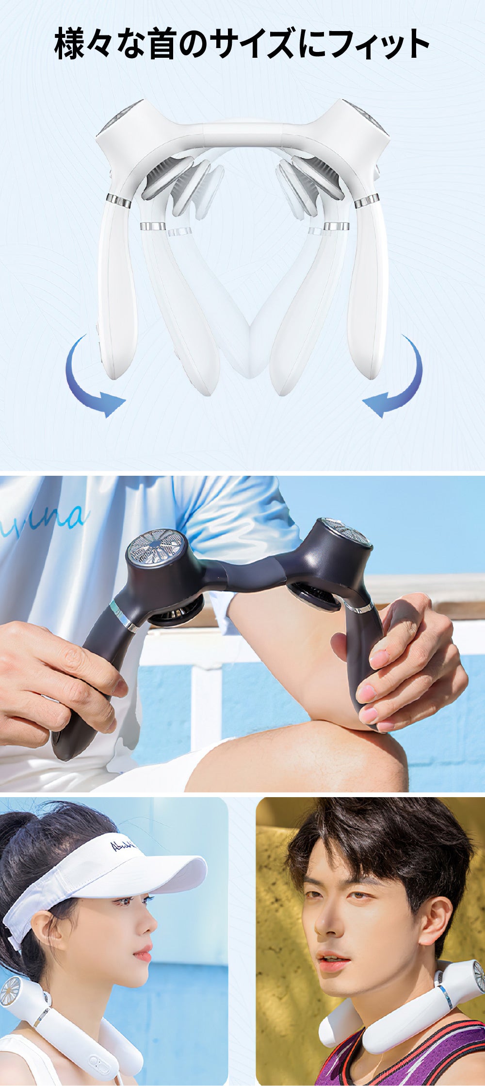 首周りがすっぽり風に包まれ、上下方向と垂直方向の2種類の風が涼しさを運んできます。
