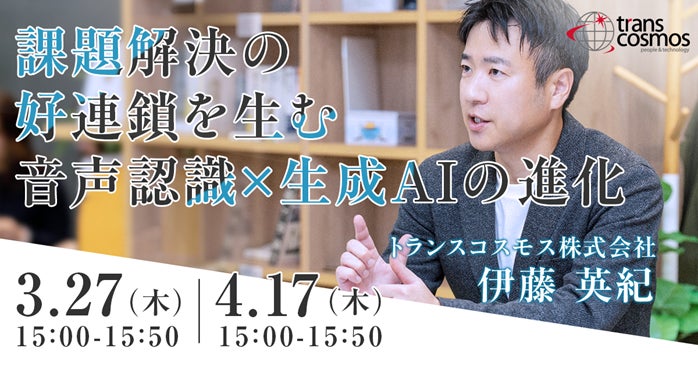 トランスコスモスは、オンラインセミナー課題解決の好連鎖を生む音声認識×生成AIの進化を3月27日(木)、4月17日(木)に開催します。