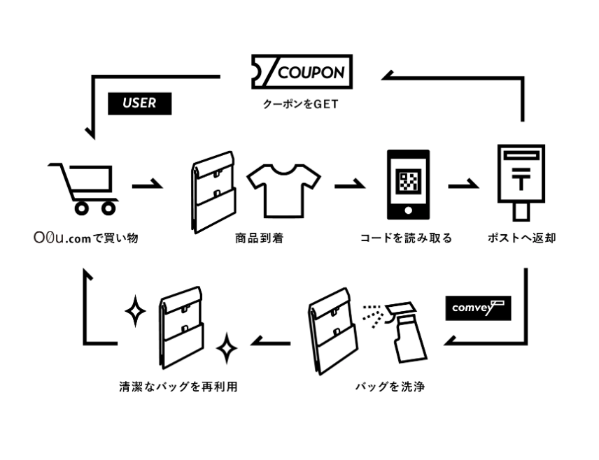物流、配送分野で問題となっている年間150万トンもの梱包ゴミについては、「O0u」でもかねてより梱包材の省資源化、環境負荷の低減ができないかと思案していました。今回、その問題に取り組むべく、株式会社comveyが提供している、繰り返し使えるシェアバッグで人にも地球にも優しいサステナブルな新配送サービスの導入を果たしました。