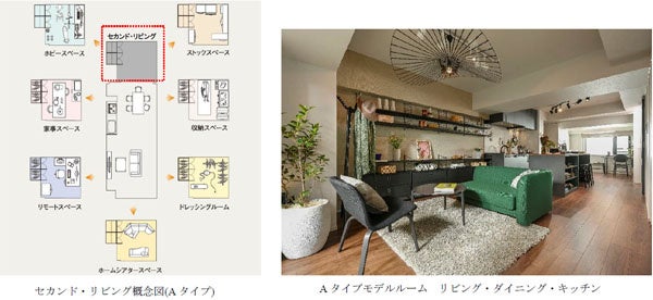 全49戸中31戸で、ダイニングキッチンの横に多彩なアレンジが可能なセカンド・リビングを配置しました。パートナーと同じ空間に居ながらも各々の時間を過ごしたり、書斎や趣味を楽しむプラスアルファの空間として利用したり、可変的な空間がライフスタイルの可能性と自由度を広げます。現在だけでなく、将来の家族構成やライフスタイルの変化にも思いを馳せた間取りプランとしています。