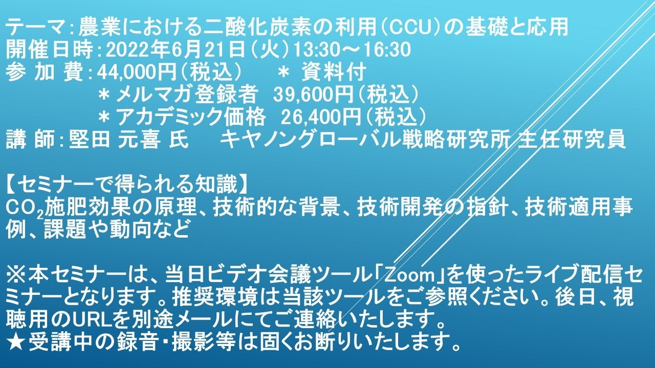 先端技術情報や市場情報を提供している(株)シーエムシー・リサーチ(千代田区神田錦町: https://cmcre.com/ )では、 各種材料・化学品などの市場動向・技術動向のセミナーや書籍発行を行っておりますが、 このたび「農業における二酸化炭素の利用(CCU)の基礎と応用」と題するセミナーを、 講師に堅田 元喜 氏 キヤノングローバル戦略研究所 主任研究員)をお迎えし、2022年6月21日(火)13:30より、 ZOOMを利用したライブ配信で開催いたします。 受講料は、 一般:44,000円(税込)、 弊社メルマガ会員:39,600円(税込)、 アカデミック価格は26,400円(税込)となっております(資料付)。
