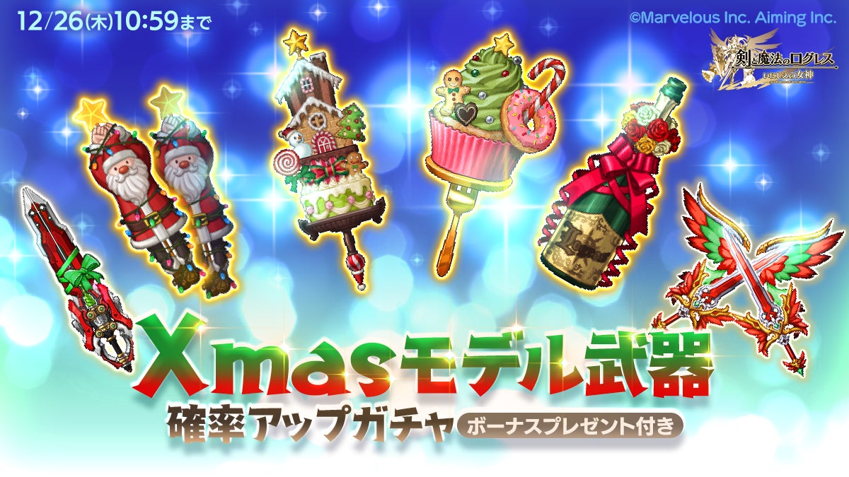 株式会社マーベラス(代表取締役社長:佐藤 澄宣/所在地:東京都品川区)は、スマートフォン向け本格オンラインRPG『剣と魔法のログレス いにしえの女神』において、2024/12/11(水)にイベント「にゃんダフル・クリスマス-inローグピア-」の開催、および「Xmasモデル武器確率アップガチャ」の販売を含むアップデートを行ったことをお知らせいたします。