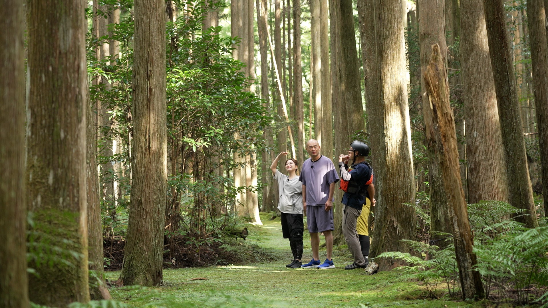 集落を抜けた先に、地元の人しか知らない、まさに"ウラスポット"とも言える神秘的な「苔の道」を発見!元々は集落や畑として利用していたそうですが、2011年以降は人の手が入らなくなり、自然にヒノキゴケやジャゴケ、ゼニゴケが群生してできた道になったそうです。 地元の人も知らないキレイな一本道に二人は思わず寝転び、その感触を確かめます。