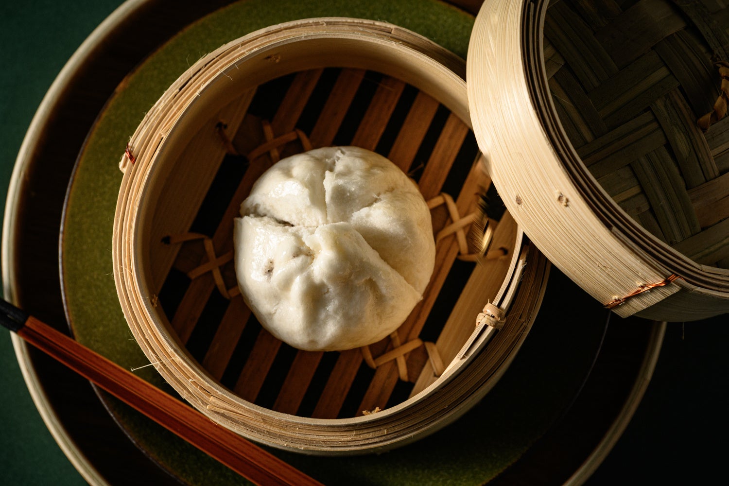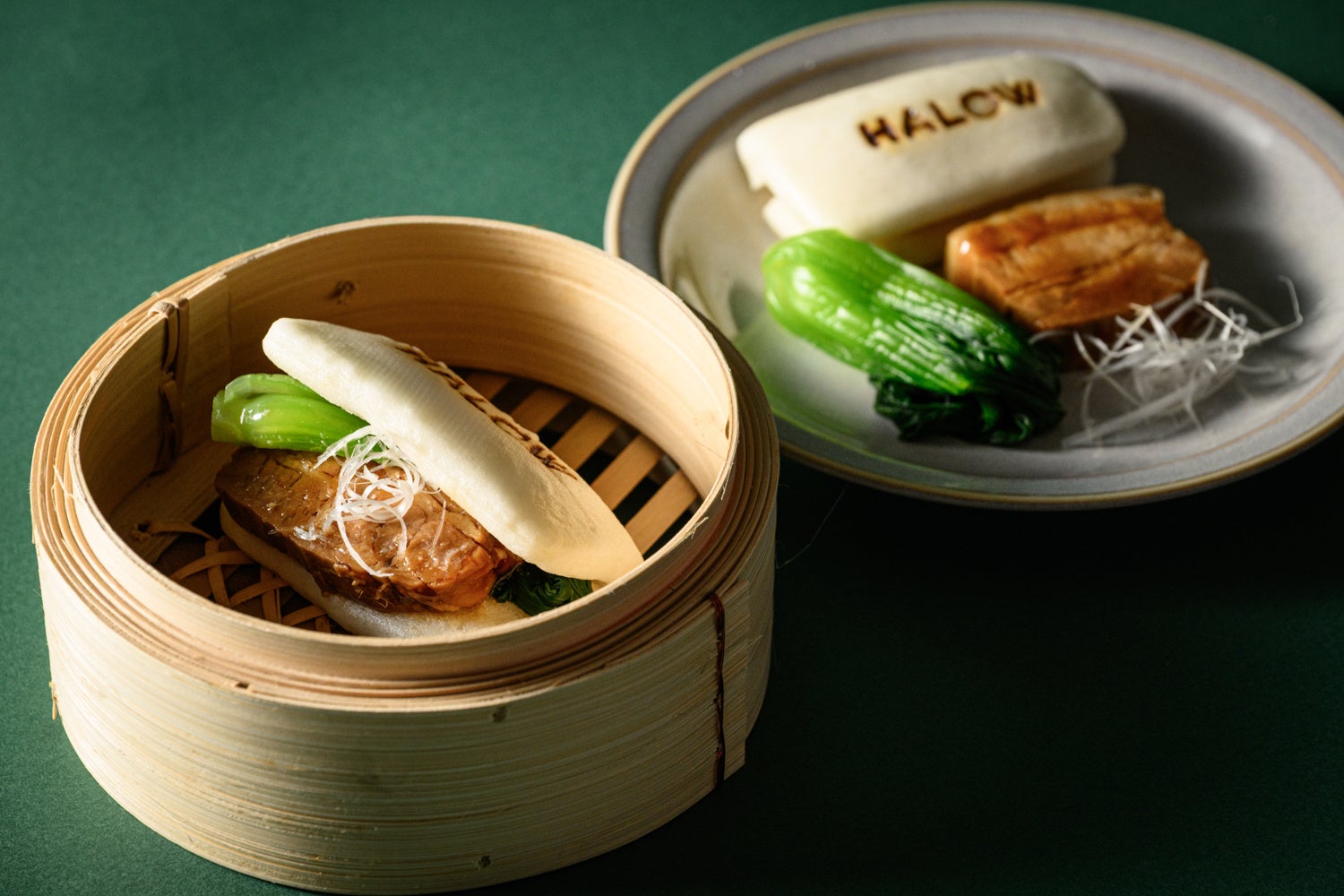 HALOWオリジナル焼き印入りのふわふわでやわらかい中華バンズに、別皿添えの豚角煮&ミニチンゲン菜をお客様ご自身でつつんで仕上げる蒸籠です。