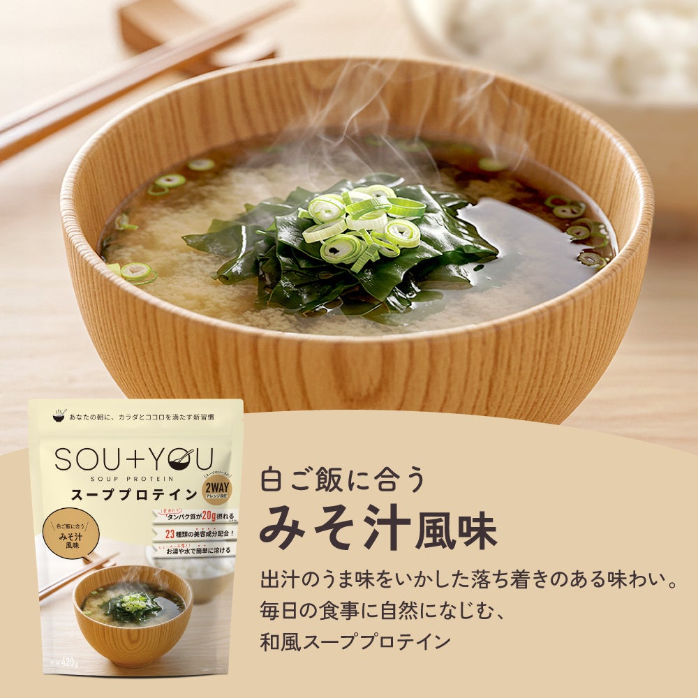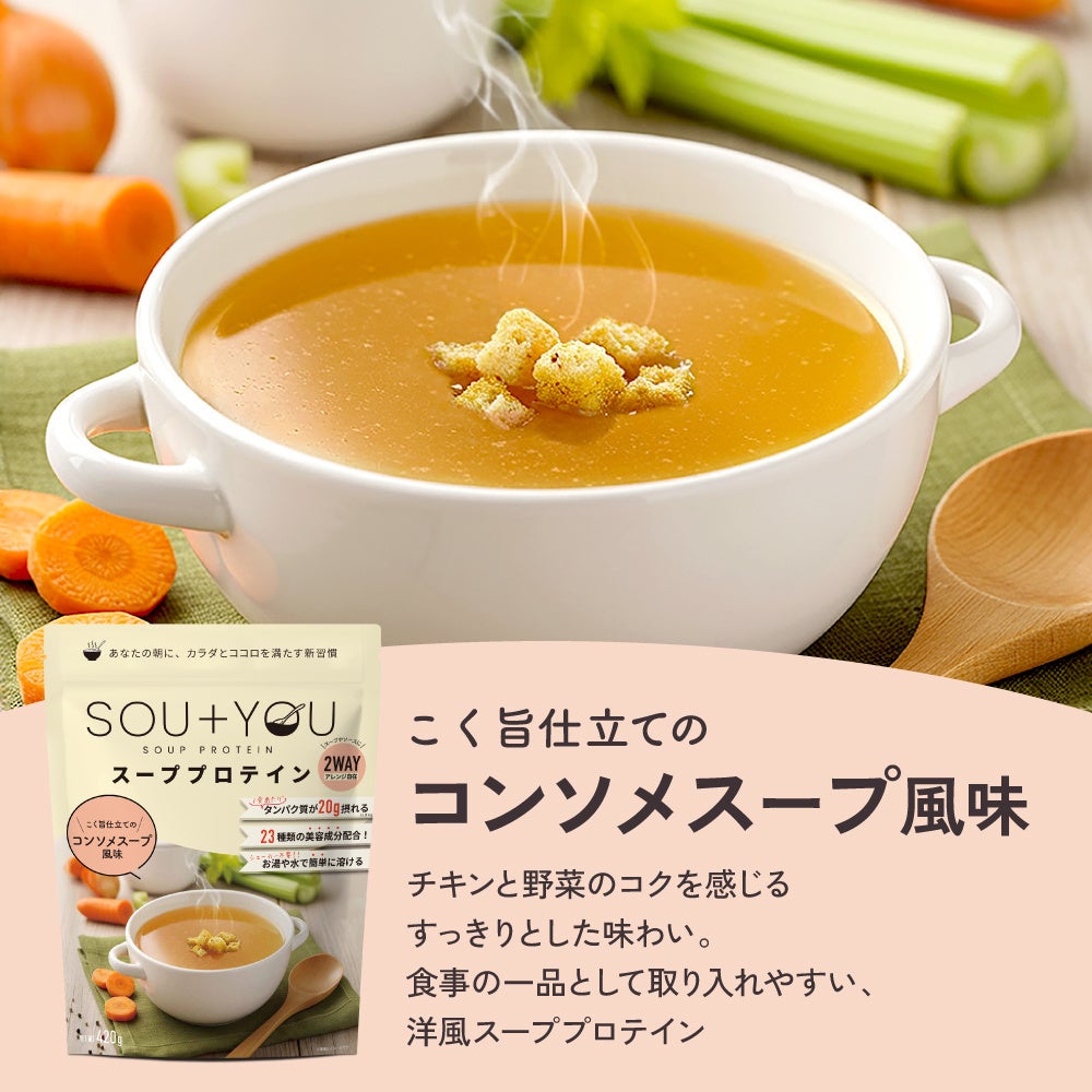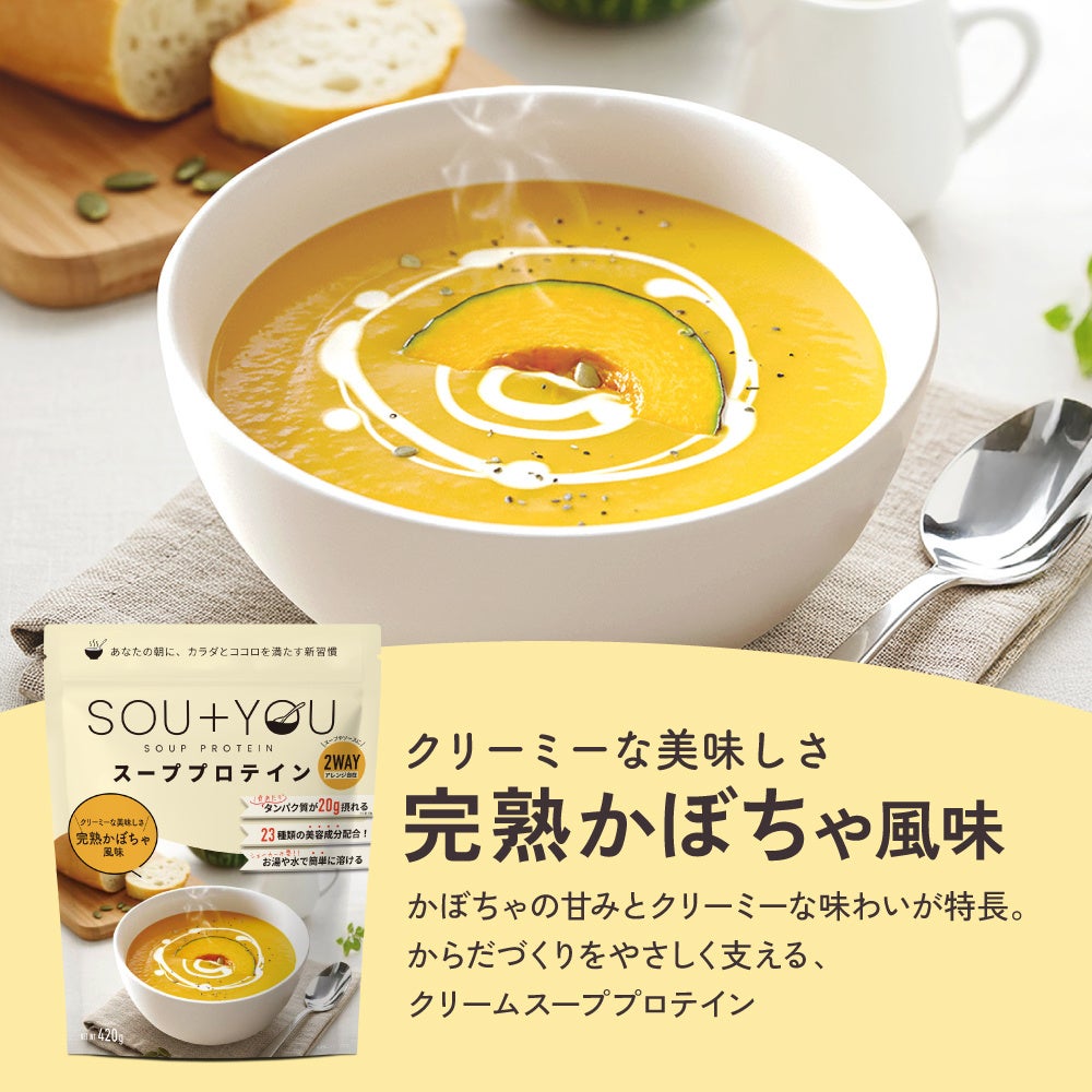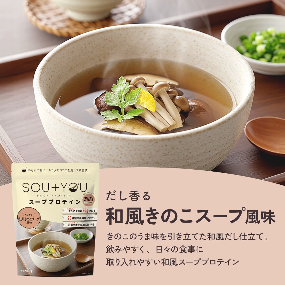 近年、気温の高い日が増える中で、これからの季節は、食欲が落ちやすくなったり、冷たい飲料や軽食に偏りがちになるなど、食生活が変化しやすい時期です。忙しい日常の中で食事を簡略化しがちな現代人にとって、「しっかり栄養を摂ること」と「無理なく続けられること」の両立は容易ではありません。こうした背景の中で、「日常に取り入れやすい栄養習慣」へのニーズが高まっています。「SOU+YOU」は、温かいスープとして取り入れることで、食事の一部として自然にたんぱく質を補給できる設計とし、季節を問わず続けやすい商品として開発されました。
