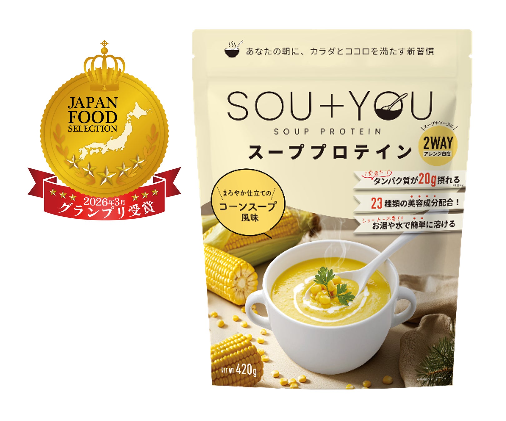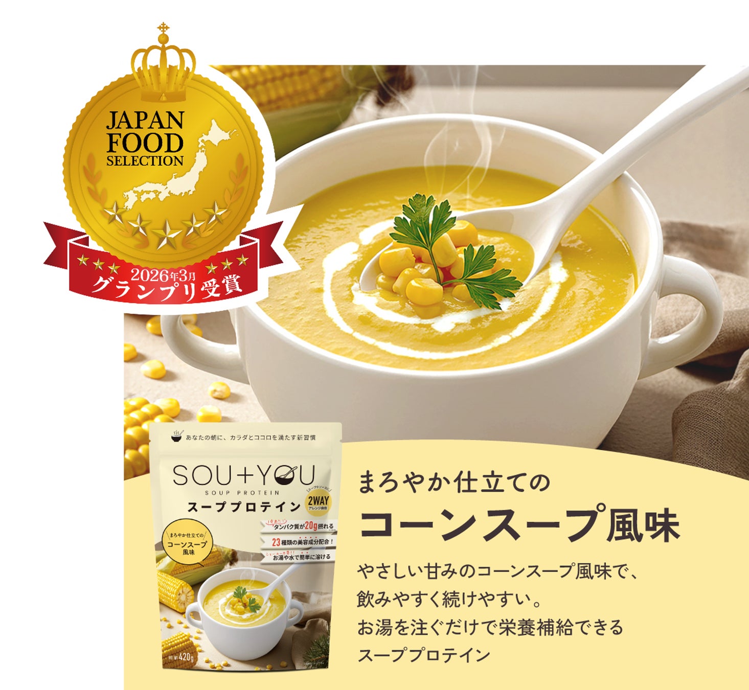 これから迎える暑い季節、食欲がない日でも続く。“スーププロテイン” という新習慣。SOU+YOU コーンスープ風味が「ジャパン・フード・セレクション」グランプリ受賞!!