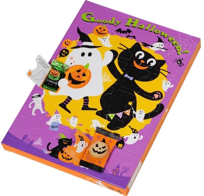 ダンスパーティーを楽しむ黒猫やおばけたちが描かれた箱の扉には、お菓子が隠れています。