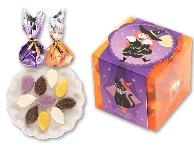 “黒猫”と“魔女”の絵柄の巾着には、“かぼちゃ”と“紫いも”の風味のリーフチョコが楽しめます。