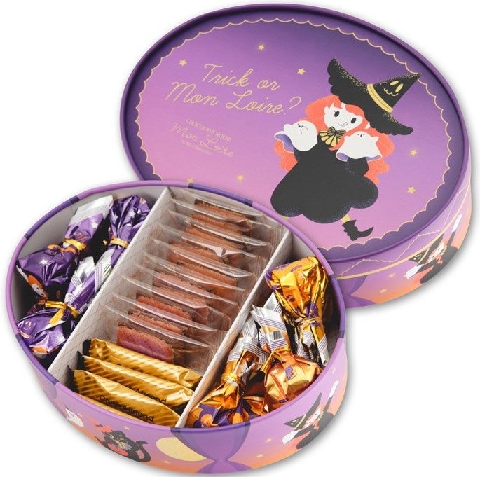 ハロウィンがモチーフの丸箱に、ハロウィン限定の“リーフメモリー”や“ハロウィンラング”、人気のチョコレート“クラッシュアーモンド”が入っています。チョコレートとクッキーがセットになった、ハロウィンの限定ギフト