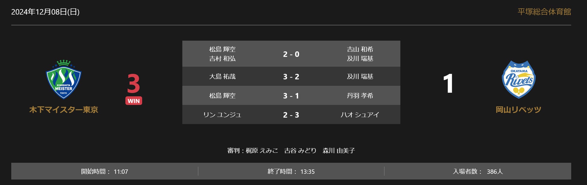 ノジマTリーグ 2024-2025シーズン 公式戦 12月8日開催 木下マイスター東京 vs 岡山リベッツの試合は、3-1で木下マイスター東京が勝利しました。
